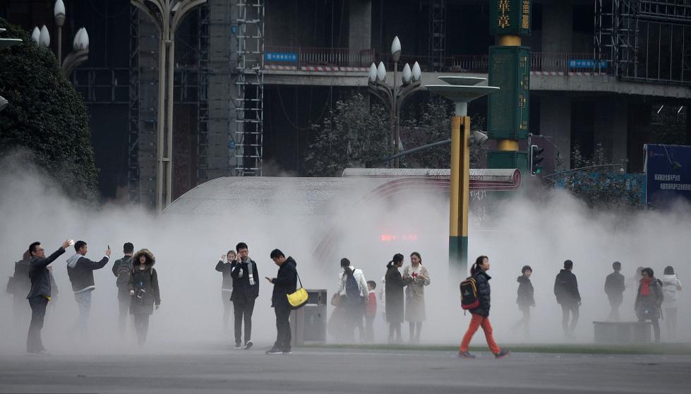 2017年12月23日,成都。天府廣場西側(cè)和南側(cè)有了新變化——上午10點,綠油油的草坪上空開始籠罩著層層白色霧氣,仿佛置身于仙境一般。走近一點,還有水霧襲來,平添一分清新和涼意。