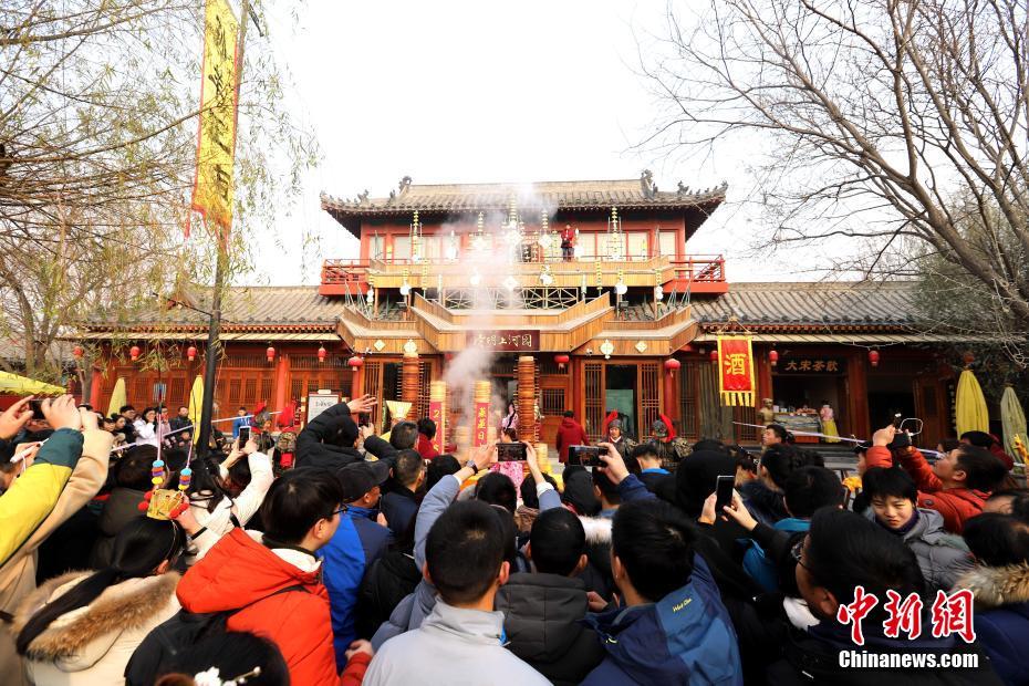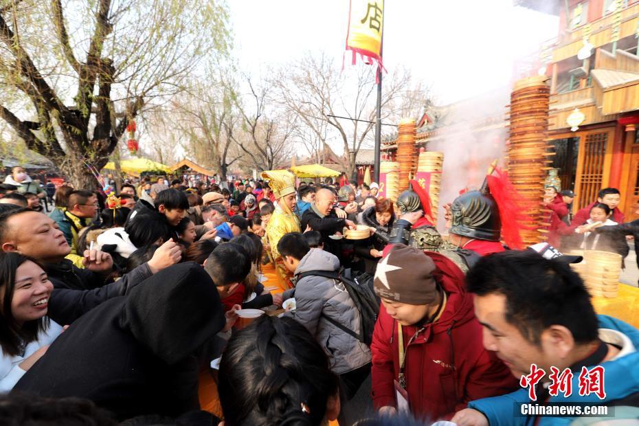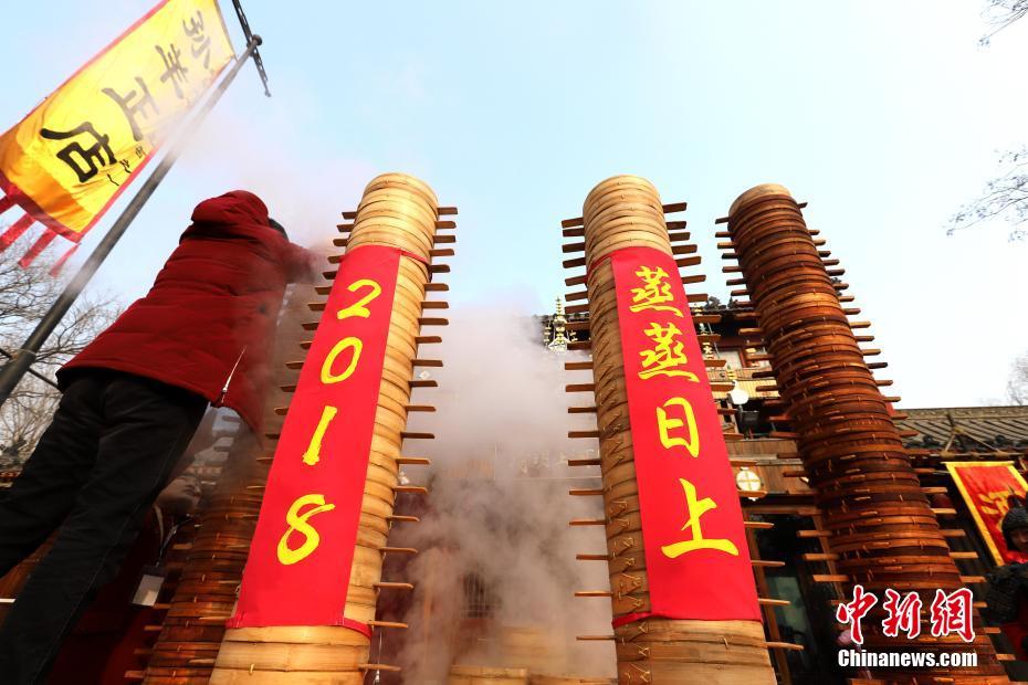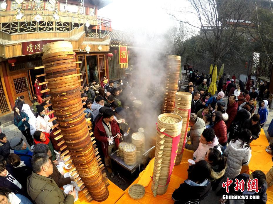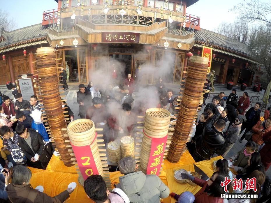 2018年1月1日,河南開封清明上河園孫羊正店門前,現(xiàn)場高高疊起的小籠包熱氣騰騰,小籠包上喜慶的紅字寫著“2018”“蒸蒸日上”。“宋徽宗”帶領(lǐng)“后宮佳麗”為游客免費(fèi)發(fā)放剛剛蒸好的小籠包,寓意新的一年“蒸蒸日上”,吸引數(shù)千名游客爭相品嘗求好運(yùn)。據(jù)清明上河園市場部石經(jīng)理介紹,為了給游客送上這份新年祝福,清明上河園啟用了多個地方一起蒸小籠包,當(dāng)天共準(zhǔn)備了2018籠開封名吃“灌湯包”,在多個發(fā)放點(diǎn)陸續(xù)為民眾送上新年的“免費(fèi)午餐”,祝愿大家都能夠在新的一年里“蒸蒸日上”。中新社記者 王中舉 攝