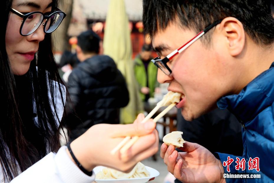 2018年1月1日,河南開封清明上河園孫羊正店門前,現(xiàn)場高高疊起的小籠包熱氣騰騰,小籠包上喜慶的紅字寫著“2018”“蒸蒸日上”?!八位兆凇睅ьI(lǐng)“后宮佳麗”為游客免費(fèi)發(fā)放剛剛蒸好的小籠包,寓意新的一年“蒸蒸日上”,吸引數(shù)千名游客爭相品嘗求好運(yùn)。據(jù)清明上河園市場部石經(jīng)理介紹,為了給游客送上這份新年祝福,清明上河園啟用了多個地方一起蒸小籠包,當(dāng)天共準(zhǔn)備了2018籠開封名吃“灌湯包”,在多個發(fā)放點(diǎn)陸續(xù)為民眾送上新年的“免費(fèi)午餐”,祝愿大家都能夠在新的一年里“蒸蒸日上”。中新社記者 王中舉 攝