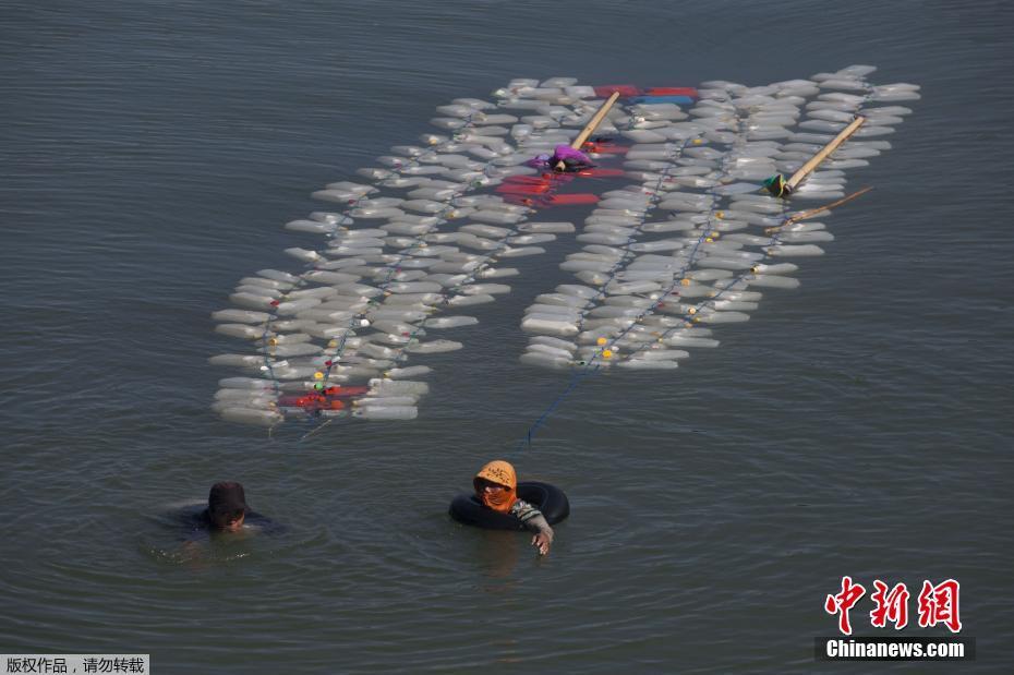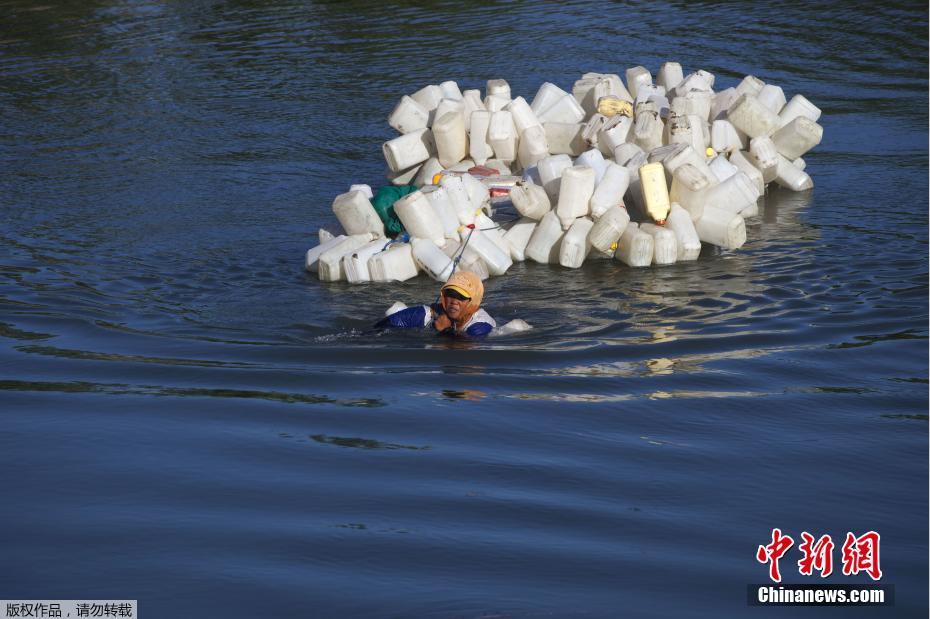 當(dāng)?shù)貢r(shí)間2018年3月21日, 印尼西蘇拉威西省Tinambung,村民Mama Hasria和其他當(dāng)?shù)嘏悦刻毂澈笙抵s200個(gè)空壺子逆流而上,到河上游為他們的社區(qū)打干凈的水。