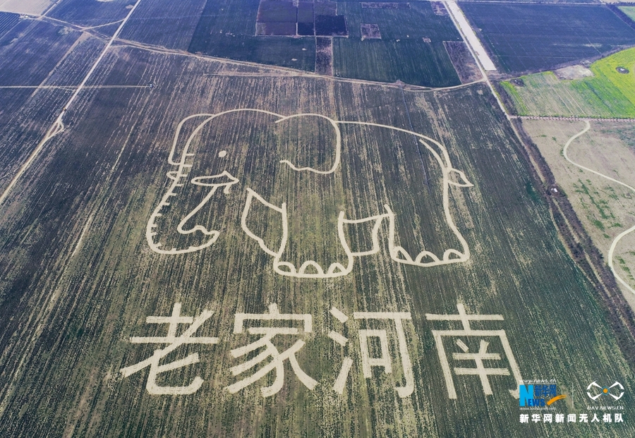 近日,《老家河南》創(chuàng)意圖案亮相河南省溫縣境內(nèi)的黃河濕地。據(jù)介紹,這幅圖案占地一公頃,主要通過圖案設(shè)計(jì)、定點(diǎn)測(cè)繪、錯(cuò)季間作、田間管理等環(huán)節(jié)制作而成,《老家河南》由大象圖案和“老家河南”字樣組成。新華網(wǎng)發(fā) 徐宏星攝