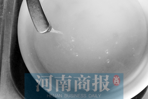 進入一居民家后,居民迫不及待地打開水龍頭。河南商報記者看到,剛從水龍頭里接出來的水確實像面湯一樣白稠,放置半分鐘后,水開始變清,再過一段時間,接水盆盆底開始顯現(xiàn)出一層紅色的沙子。