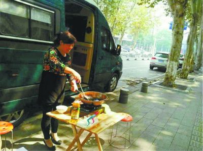 圖片顯示,一輛墨綠色的房車停在一所學校的大門附近,房車旁邊,一名中年婦女正揮舞鍋鏟當街炒菜,不少路人駐足圍觀。