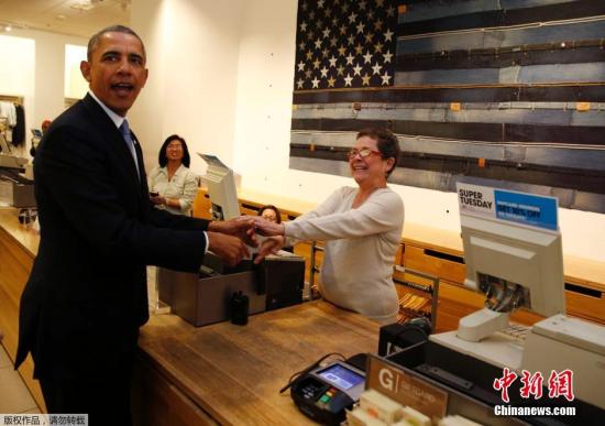 資料圖:當(dāng)?shù)貢r(shí)間2014年3月11日,美國(guó)紐約,美國(guó)總統(tǒng)奧巴馬在服裝商店中為妻女選購(gòu)衣物。