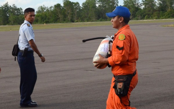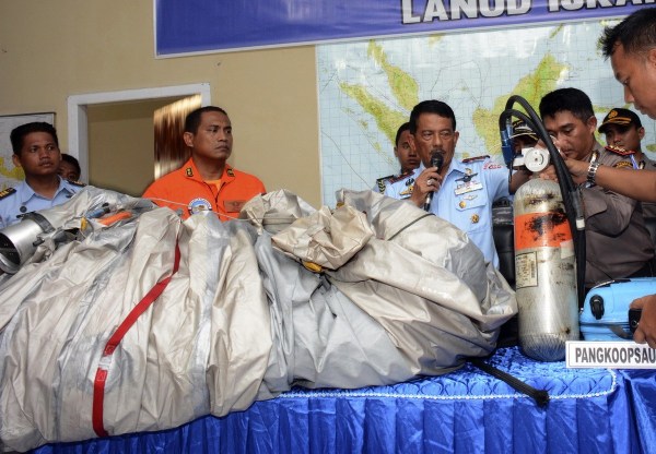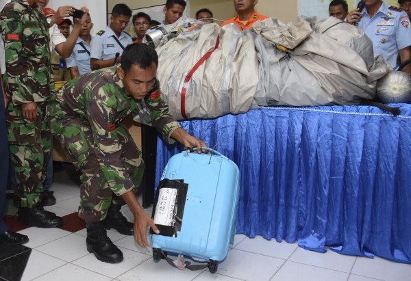 當(dāng)?shù)貢r(shí)間2014年12月30日,印尼龐卡蘭布翁,雅加達(dá)空軍基地指揮官M(fèi)arshal Dwi Putranto正在展示從現(xiàn)場(chǎng)打撈上來的一個(gè)緊急滑梯和乘客的行李箱。
