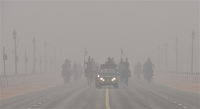 2016年1月7日,印度新德里,印度士兵在霧霾中進(jìn)行共和日閱兵彩排。印度媒體報道稱,機(jī)動車排放是新德里空氣污染的重要原因。自今年1月1日起,新德里實(shí)行單雙號限行,交通擁堵情況得到明顯改善。