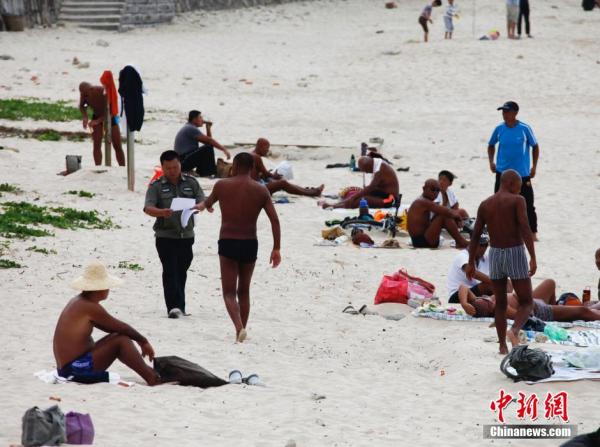 2月6日上午,春節(jié)黃金周最后一天,三亞市綜合行政執(zhí)法局執(zhí)法人員在三亞大東海海灘向游人發(fā)放三亞市政府關(guān)于禁止在公共場所裸泳、裸曬的公告。當(dāng)日,三亞綜合行政執(zhí)法、公安、武警等部門的人員在三亞大東海海灘勸說游客不要裸泳、裸曬,開始整治公共海灘的裸泳、裸曬的現(xiàn)場。