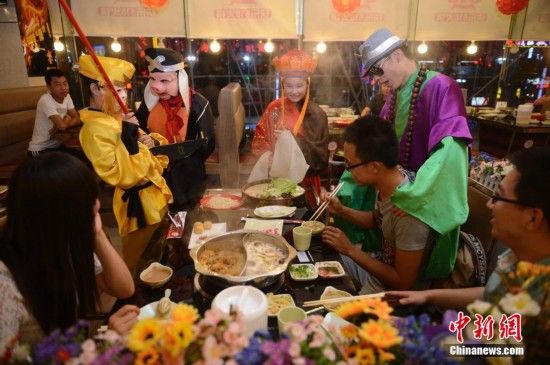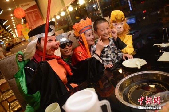7月13日,內(nèi)蒙古呼和浩特一飯店內(nèi),工作人員扮作《西游記》中的唐僧師徒,跳舞為顧客用餐助興。中新社發(fā) 劉文華 攝