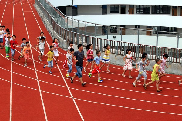 圖為學(xué)生們首次在環(huán)形跑道上跑步玩耍。