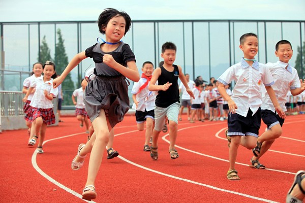 2014年9月1日,浙江省臺(tái)州市,天臺(tái)縣赤城街道第二小學(xué)的房頂環(huán)形跑道正式啟用,學(xué)生們首次在環(huán)形跑道上跑步玩耍。據(jù)了解,天臺(tái)縣赤城街道第二小學(xué)由于學(xué)校建設(shè)用地不足,該校在教學(xué)樓四樓頂設(shè)計(jì)了200米環(huán)形跑道,這一做法在全國(guó)尚屬首例。孫金標(biāo)/CFP
