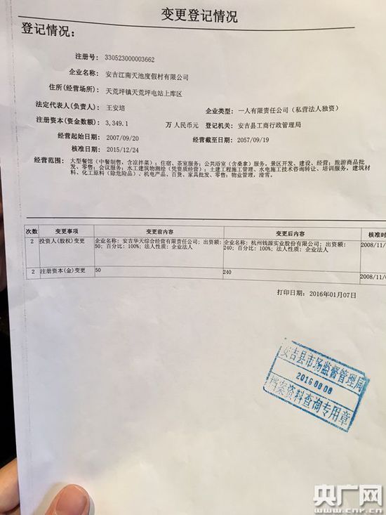 對此,王安培在接受記者采訪時稱,自己在2009年退休前,的確是電站工會主席,但江南天池公司和電站沒有關系:“我退休之前是電站的工會主席,09年退休,之前是不能搞三產(chǎn)的,這個我們是有規(guī)定的。10年推我當董事長,變更法人成我的。錢源是我們退休的老同志,大家出點錢,在杭州注冊了一家錢源公司,拿了一點錢在安吉搞了一個江南天池度假村,和原來的三產(chǎn)沒有延續(xù)?!?/p>