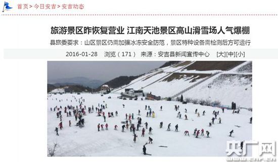 雖然安吉縣委宣傳部副部長祝青稱滑雪場營業(yè)馬上就結束了,但根據(jù)安吉縣政府官方網(wǎng)站報道,1月28號,江南天池滑雪場恢復營業(yè),人氣爆棚。
