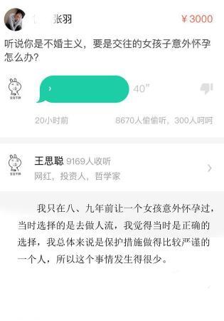 近日,某醫(yī)院醫(yī)生張羽在某平臺(tái)中向王思聰提問(wèn):“聽說(shuō)你是不婚主義,要是交往的女孩子意外懷孕怎么辦?”在40秒的回答中,王思聰爆料自己毫不手軟:“我只在八九年前讓一個(gè)女孩意外懷過(guò)孕,但后來(lái)大家的選擇是流掉,我覺(jué)得是正確的選擇。 但現(xiàn)在我的保護(hù)措施是非常好的,一般不會(huì)有意外了?!鼻巴巴德牎钡木W(wǎng)友們紛紛表示:“老公坦誠(chéng)得讓我震驚啊……”“感覺(jué)要上娛樂(lè)八卦頭條的節(jié)奏!”