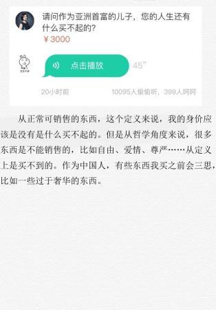 還有網(wǎng)友好奇首富獨(dú)子的消費(fèi)觀,問(wèn)王思聰平均在每個(gè)女朋友身上的花費(fèi)是多少。王思聰給出的答案依然很實(shí)在:“從我17、8歲初戀到現(xiàn)在十幾年了,在每個(gè)女朋友身上的消費(fèi),完全取決于當(dāng)年的我有多少錢,十七八歲的時(shí)候錢也不多,或許會(huì)買的幾百幾千的飾品,但隨著自己歲數(shù)越來(lái)越大,也會(huì)買幾萬(wàn),甚至幾十萬(wàn)的東西,很難算出平均的花費(fèi),有一點(diǎn)是確定的,隨著歲數(shù)越來(lái)越大,可支配的資金越來(lái)越多,在每個(gè)女朋友身上花的錢是越來(lái)越多的。”