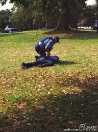 一名目擊導(dǎo)游說:“剛才有兩個(gè)客人在悉尼草坪上方便,讓警察看見了。警察追他們,他們提著褲子跑。他們惱羞成怒,要打警察。警察一個(gè)過肩摔,把一個(gè)男的摔地上骨折了?,F(xiàn)在救護(hù)車,警車都過來了。”