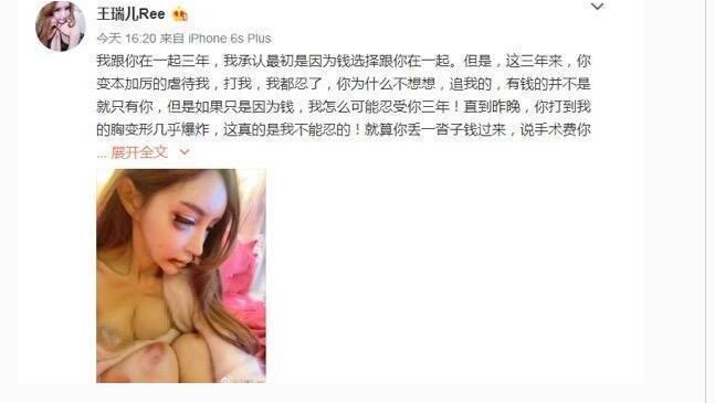 近日,曾有“第一網(wǎng)紅”之稱的嫩模王瑞兒在微博發(fā)文自曝被男友嚴(yán)重家暴,她大膽曬出右眼紅腫不堪、嘴角流血的“被虐打”慘狀,并稱胸被打到“變形幾乎爆炸”,和劉梓晨神似龍鳳胎。據(jù)稱,王瑞兒整容過(guò)的假胸價(jià)值高達(dá)百萬(wàn)。王瑞兒自稱與男友交往三年,大方承認(rèn)最初在一起是貪圖對(duì)方“有錢(qián)”,三年來(lái)遭受了無(wú)休止的虐待和毆打,此次更是變本加厲險(xiǎn)些將胸“打爆”,這才怒而提出分手:“請(qǐng)你滾蛋,從此遠(yuǎn)離我的生活……如果再跟你在一起,我將萬(wàn)劫不復(fù)!”