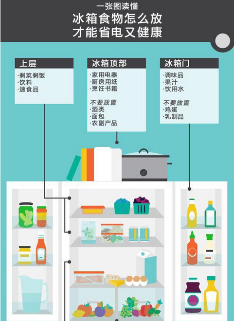 冰箱上層的溫度最為穩(wěn)定,而下層的溫度則最低。飯店常用的一種擺放方法是,把不需要烹飪的食物放在接近冰箱頂部的地方,比如剩菜剩飯、飲料、速食品等。