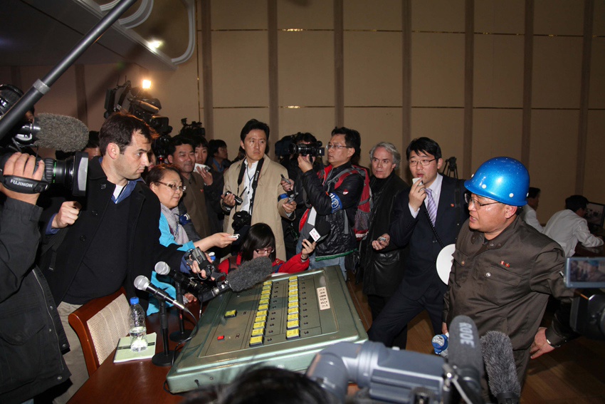2012年4月8日,在朝鮮平安北道鐵山郡東昌里的“西海衛(wèi)星發(fā)射場(chǎng)”監(jiān)控中心,“西海衛(wèi)星發(fā)射場(chǎng)”總負(fù)責(zé)人張明進(jìn)(戴藍(lán)盔者)向記者介紹情況。