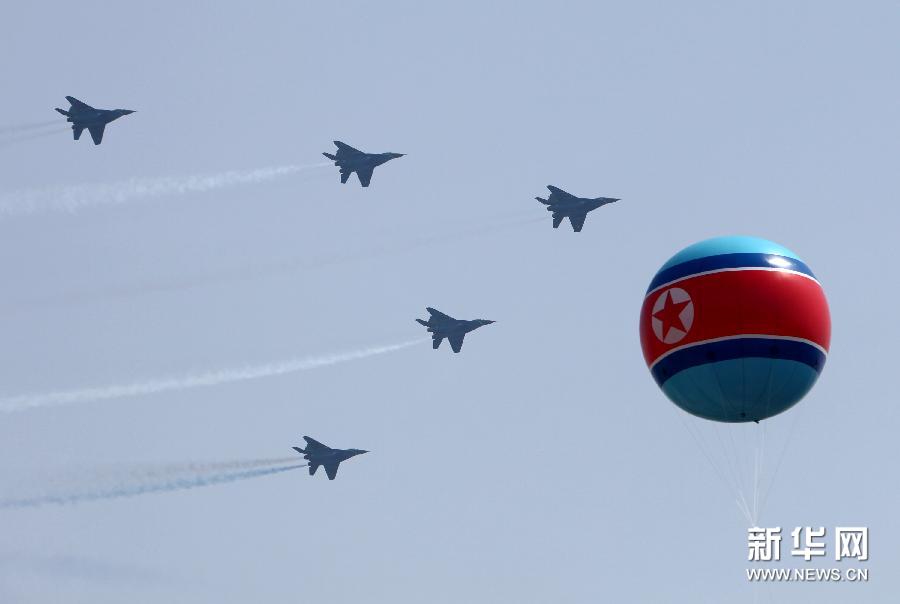 4月15日,戰(zhàn)斗機(jī)在朝鮮首都平壤舉行的閱兵式上進(jìn)行表演。當(dāng)日,朝鮮在金日成廣場舉行盛大閱兵式,慶祝金日成誕辰100周年。朝鮮國家最高領(lǐng)導(dǎo)人金正恩出席閱兵式并發(fā)表演講。 新華社記者張利攝