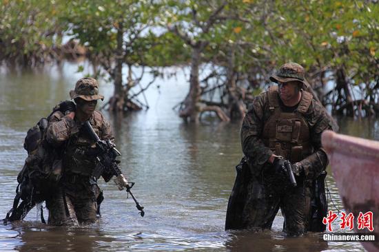 4月25日,美國與菲律賓“肩并肩2012”聯(lián)合軍演參演部隊在菲律賓南部巴拉望省普林塞薩港市的阿魯甘灣舉行“兩棲登陸”演練,美菲雙方近百名海軍陸戰(zhàn)隊士兵參加。這也是美菲“肩并肩2012”聯(lián)合軍演開幕10天以來,開放媒體采訪規(guī)模最大的一場軍事演習活動。圖為美菲海軍陸戰(zhàn)隊先遣小分隊登上灘頭。記者張明攝