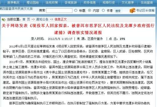 關(guān)于網(wǎng)絡(luò)發(fā)表《現(xiàn)役軍人回家探親,被普洱市思茅區(qū)人民法院及龍?zhí)多l(xiāng)政府強(qiáng)行逮捕》調(diào)查核實(shí)情況通報(bào)