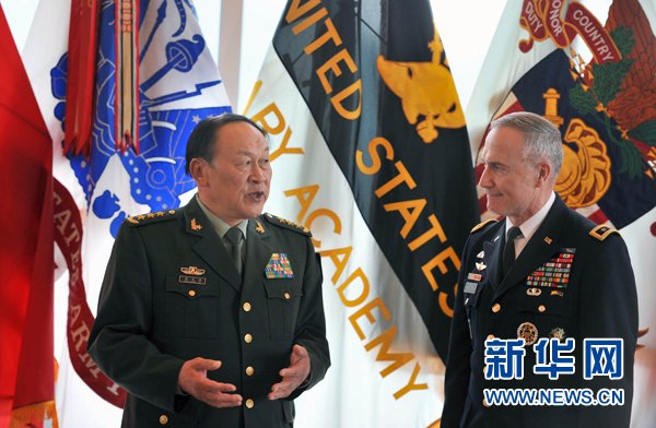 5月10日,中國(guó)國(guó)務(wù)委員兼國(guó)防部長(zhǎng)梁光烈(左)在美國(guó)西點(diǎn)軍校會(huì)見(jiàn)西點(diǎn)軍校校長(zhǎng)大衛(wèi)·亨頓中將。當(dāng)天,中國(guó)國(guó)務(wù)委員兼國(guó)防部長(zhǎng)梁光烈訪問(wèn)美國(guó)西點(diǎn)軍校,向西點(diǎn)軍校贈(zèng)送圖書(shū)并與學(xué)生交流。 新華社記者王雷攝
