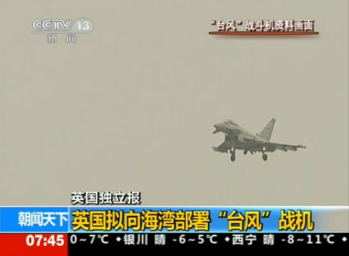 據(jù)英國《獨立報》11月2日消息,隨著與伊朗在其核項目上對峙持續(xù)、地區(qū)局勢緊張之際,英國擬考慮向海灣部署歐洲“臺風(fēng)”戰(zhàn)斗機。但報道指出,這一部署需要在同阿聯(lián)酋商議、并取得其對英國出現(xiàn)在地區(qū)的支持之后才能決定。