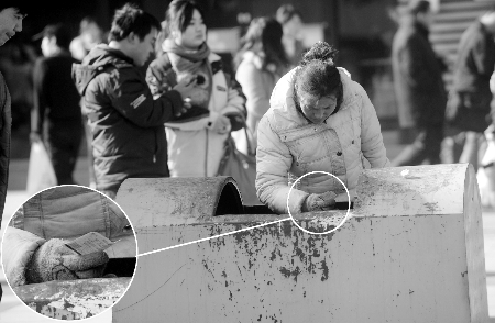 昨日上午11時(shí)許,在鄭州火車站北出站口旁,一名穿藍(lán)色棉襖的女子一直站在垃圾桶旁邊,手拎著裝有塑料瓶的黑色袋子,見人扔?xùn)|西就盯著人家的手。