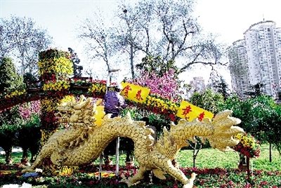 此次花展分別布置了“雙龍競春”、“綠島探春”等5個立體和平面花壇,有配花如牽?;?、三色堇等兩萬余盆,另有袖珍葉子、散尾葵、綠茉莉、夏威夷等近千盆點(diǎn)綴,其中景點(diǎn)“樂童嬉春”的“魔方”使用7000余枝鮮切花康乃馨制成。