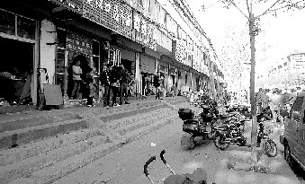 在潁河西路,道路兩側(cè)的機動車隨意停放,路面污水橫流、垃圾到處都是,路南側(cè)的商戶更是將非機動車道全部占用。