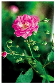 玫瑰 小葉5~9片,葉片較厚,葉面有皺紋(葉脈凹陷),葉背附一層白霜似的刺毛,枝刺多密。花多數(shù)為紫紅色、單瓣,果實肉質(zhì),花托肥厚。