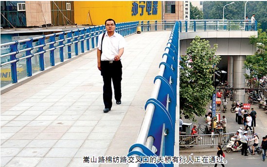 嵩山路棉紡路交叉口的天橋有行人正在通過。