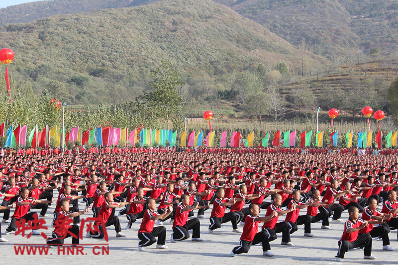 10月22日,少林寺塔溝武術(shù)學(xué)校的學(xué)員在第九屆中國鄭州國際武術(shù)節(jié)迎賓式上表演萬人團(tuán)體武術(shù)。