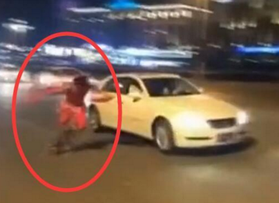 奇葩男穿輪滑扮哪吒馬路飛馳