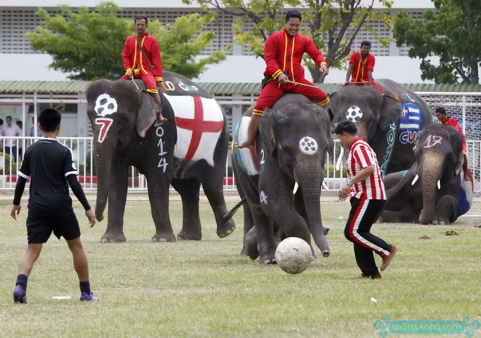 6月9日,學(xué)生們與身上畫有世界杯參賽球隊(duì)國旗圖案的大象踢足球。 當(dāng)日,在泰國大城府舉行了一場(chǎng)有大象參與的“世界杯”足球比賽。 新華社/路透