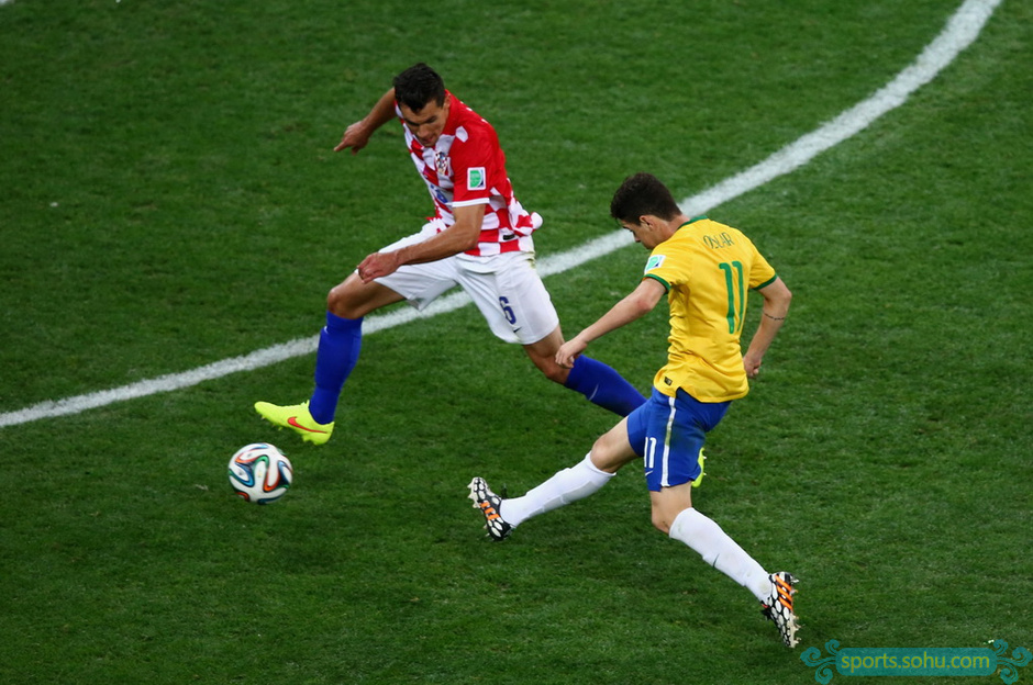 在巴西和克羅地亞的比賽最后時刻,拉米雷斯中場斷球,奧斯卡單騎闖關(guān),在禁區(qū)邊緣一記捅射再次洞穿普萊蒂科薩的十指關(guān),3-1,巴西鎖定勝局。最終,巴西隊?wèi){借內(nèi)馬爾的2個進球,3-1逆轉(zhuǎn)克羅地亞贏得本屆世界杯的開門紅。圖為奧斯卡捅射瞬間