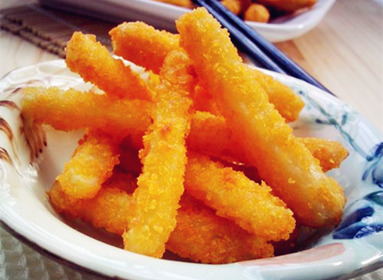 8.把地瓜條撈出來,繼續(xù)加熱油溫,再次回鍋復(fù)炸,逼出多余的油分,這時候只需十秒鐘即可撈出,不然油溫過高顏色會很快變焦黃,口感過硬,影響美觀和口感。