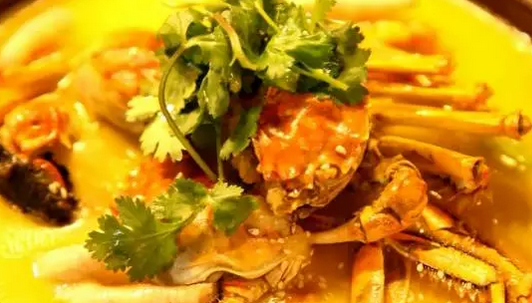 這道連機(jī)器人都要激動(dòng)得把持不住的菜品呢,是這里的招牌菜湖蟹煲了。這道菜好吃的訣竅之一呢,就是食材好。正宗的陽澄湖大閘蟹,蟹膏豐滿晶瑩剔透相當(dāng)誘人。這道菜的做法其實(shí)是相當(dāng)簡單的,簡單的炸制之后呢,就是用高湯煨煮,燉出原汁原味。