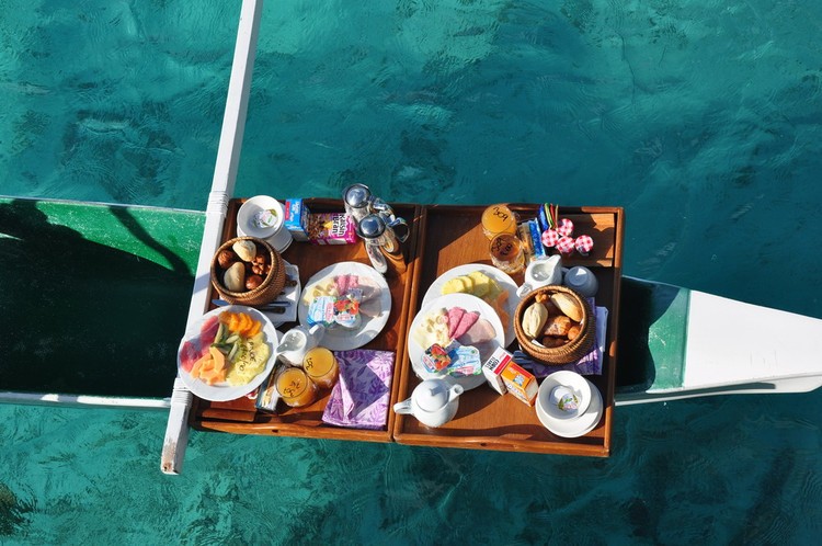 住在島上的水木屋里,睜開眼睛的時候,會有一對當?shù)氐目∧忻琅瑒澲凰要毮局?,送上濃香的咖啡,配上吐司和各色水果。當然這頓早餐價格不菲哦!
