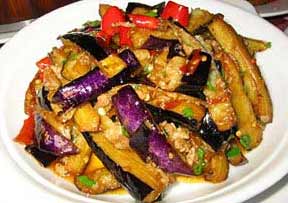 2、加中等偏大量的油, 7、8成熱的時(shí)候下鍋翻炒,待到茄子有點(diǎn)軟的時(shí)候起鍋。再在鍋中放少量油, 切好蔥姜蒜末暴之,然后放大約二兩左右的肉絲,要大一些,肉片最好,爆炒,熟了以后放茄子,立刻放醬油,少量的水,糖,雞精,鹽,悶之。