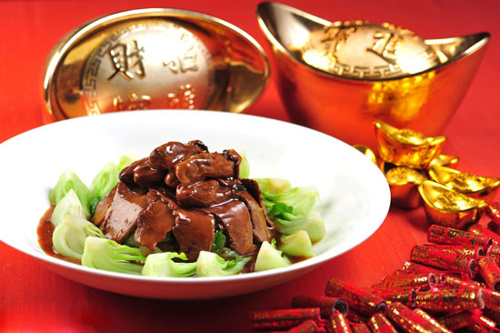 廣東人把年夜飯稱為“團(tuán)年飯”,不但飯菜品種豐富,而且很講究意頭。一家人吃團(tuán)年飯前要先祭祖或拜神,香燭燒完才開飯。席上一般有雞(寓有吉)、魚(寓年年有余)、蠔豉(寓好市)、生菜(寓生財)、腐竹(寓富足)、蒜(寓會計算)等以求吉利。廣東有的地方在吃團(tuán)年飯時,若有新婚夫婦,會多擺一副碗筷,取來年添丁吉意。