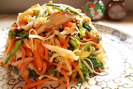《金陵歲時記》記載了南京人除夕的“十景菜”(也叫什錦菜),人們以醬姜、黃瓜、胡蘿卜、金針菇、木耳、冬筍、白芹、醬油干、百葉、面筋十種,細(xì)切成絲,以油炒之,這就是所謂的“十景”。這些菜都有著美好的寓意:黃瓜,象征瓜瓜連連、子孫蔓延;冬筍,象征雨后春筍節(jié)節(jié)高;百葉,象征百依百順樣樣順,都是要討個吉利的口彩?,F(xiàn)在的什錦菜已經(jīng)不止10種了,甚至多達(dá)16-18種,增加了藕,象征路路通;黃豆芽,象征如意;薺菜,象征聚財;馬齒莧,南京又稱安樂菜,象征平安喜樂。