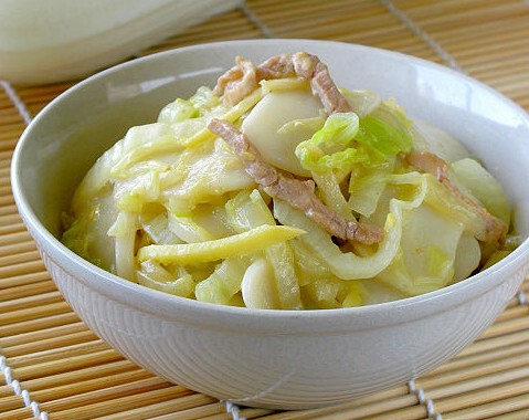 這白菜肉絲炒年糕大概每個(gè)上海煮婦都做上過(guò)幾回吧,天冷的時(shí)候,大棵的白菜囤起來(lái),切兩根年糕,撒點(diǎn)肉絲,調(diào)味簡(jiǎn)簡(jiǎn)單單,少許鹽和醬油點(diǎn)個(gè)味就行。說(shuō)是炒年糕,其實(shí)是半湯的,有少許濃稠的湯汁在里頭,年糕軟糯,吸收著大白菜和肉絲的湯汁,吃一小碗就暖心暖胃。