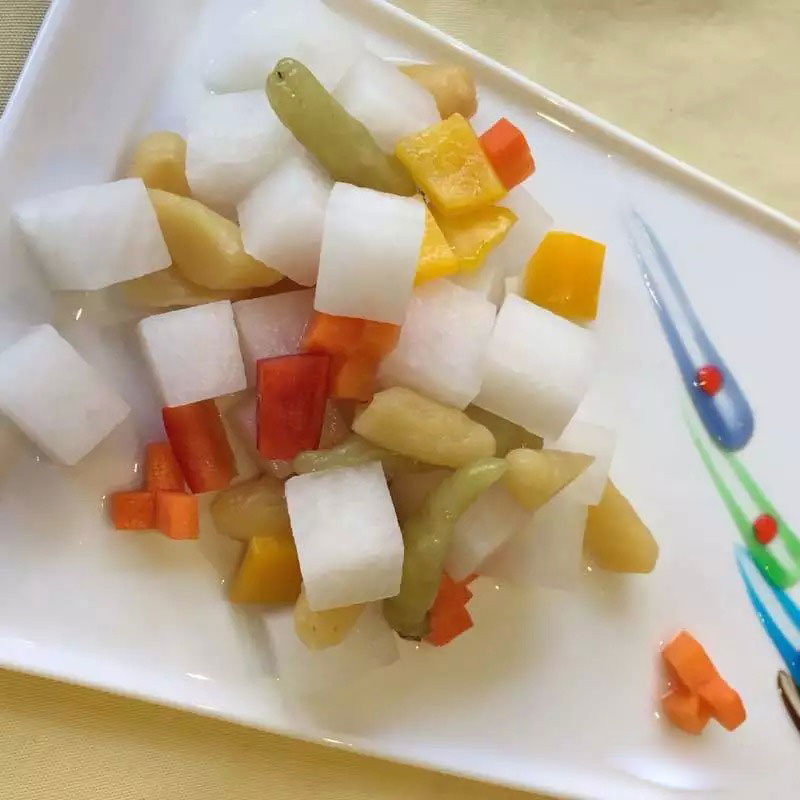 做法:象牙白蘿卜去皮切丁,仔姜和彩椒分別切丁,用白糖,白醋,玫瑰露酒調成汁,把所有原料泡進去,放冰箱腌2小時即可食用。