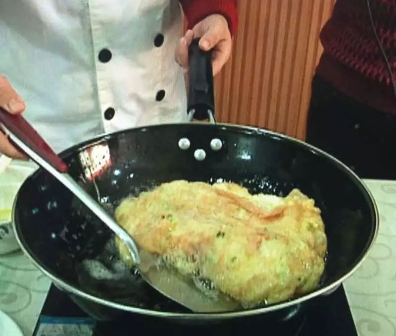 第三步,放入一點鹽等調料之后將拌入肉末的蛋液放入油鍋煎炒,成熟以后出鍋。