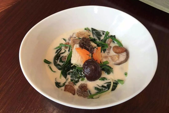 3.湯燉好后,加入菠菜,香菇,黃耳,羊肚菌,竹笙。并加入胡椒粉,花雕酒,雞粉,鹽調(diào)味。