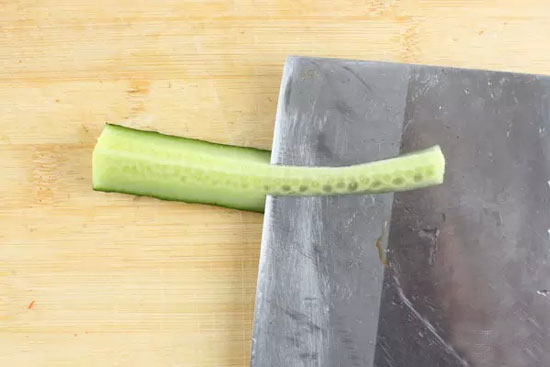 用刀片去中間的軟籽部分切成適度長短的段