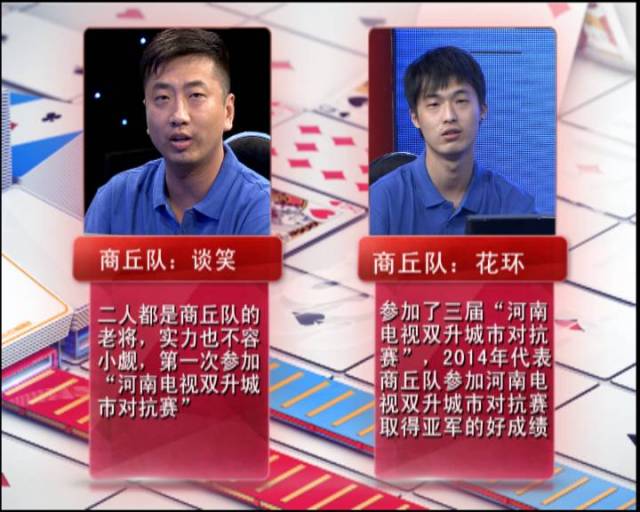 商丘隊派出了“花環(huán)”和“談笑”。兩人都是商丘隊的老將,實力不容小覷?!盎ōh(huán)”曾參加三屆“河南電視雙升城市對抗賽”;2014年代表商丘隊參加“河南電視雙升城市對抗賽”,并取得亞軍的好成績?!罢勑Α钡谝淮螀⒓印昂幽想娨曤p升城市對抗賽”。