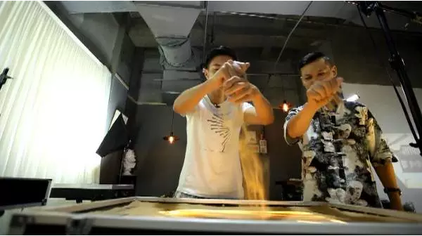 沙子的厚薄出來(lái)的效果,就是我們中國(guó)畫的墨分五色,所謂墨分五色就是濃淡干濕燥,其中的奧妙就是沙子和燈光的完美結(jié)合。