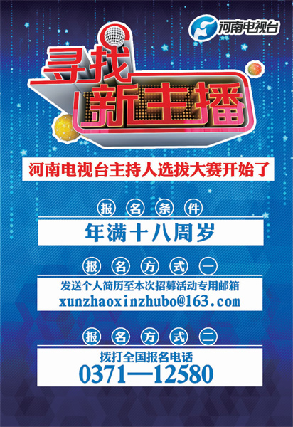 10月1日起,河南電視臺將啟動“尋找新主播”活動。這是由河南電視臺都市頻道承辦的一檔大型主持人選拔活動,選拔范圍輻射全國,無論你在哪里,無論你正在從事哪個行業(yè),只要您年滿18周歲,沒準(zhǔn)兒下一個“新主播”就是你!